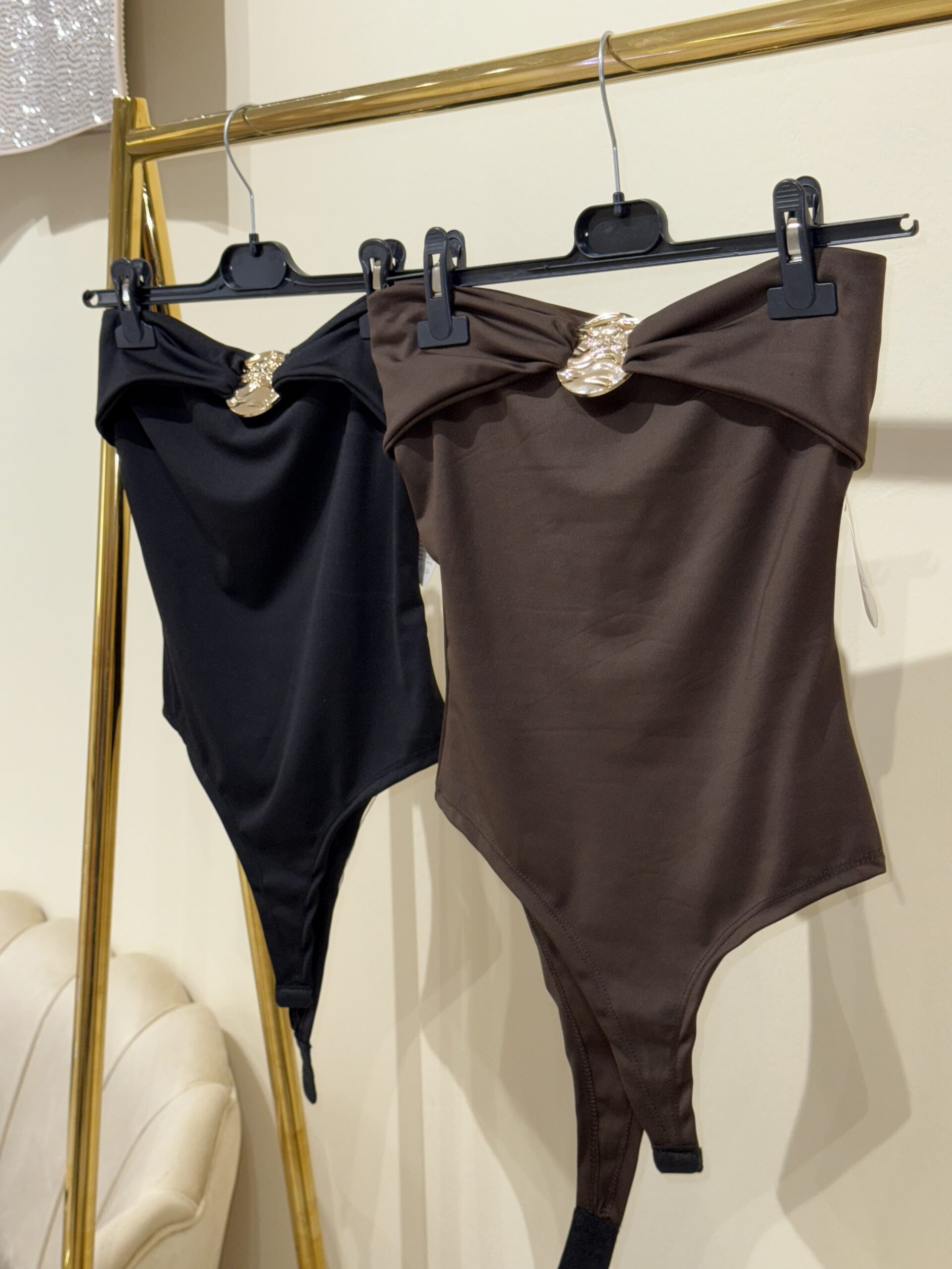 Ez a csavart pántos body egyszerűen full glam. A mellrész közepén lévő fém dísz instant emeli a szettet, úgy nézel ki benne, mintha random hétfőn is vörös szőnyegre sietnél. Az anyaga puha és rugalmas, gyönyörűen simul a testre. Fekete és barna színben érkezik — mindkettő igazi “wow” darab, ami egy magas derekú nadrággal vagy szoknyával totálisan kész outfit.